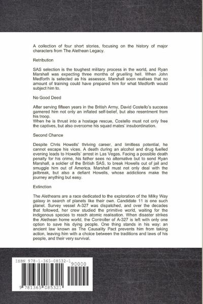 Retribution: Ryan Marshall was expecting three months of gruelling hell in SAS Selection. He soon realises that no amount of training could have prepared him for what he would be subjected to. No Good Deed: David Costello's success in the British Army garnered him the resentment of his troop. When thrust into a hostage rescue, Costello must not only free the captives, but also overcome his squad mates' insubordination. Second Chance: A death during an drug fuelled evening leads to Chris Howells' arrest in Las Vegas. Ryan Marshall, a soldier of the British SAS, is sent to break Howells out of jail and smuggle him out of America. Marshall must not only deal with the jailbreak, but also Howells, whose addictions make the journey anything but easy. Extinction: The Controller of an Alethean survey vessel is left with a single option to save his dying people. The problem: the "Causality Pact" prevents him from taking action, leaving him with a choice between the laws of his people, and their very survival.