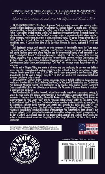 In his ongoing efforts to resuscitate and preserve authentic Southern history, popular award-winning author Colonel Lochlainn Seabrook has written The Alexander H. Stephens Reader, a one-of-a-kind, 1,050 page volume providing, as the subtitle indicates, topical Excerpts From the Works of a Confederate Founding Father. Conveniently divided into two sections, Col. Seabrook devotes thirty heavily footnoted chapters to selections from the Conservative Vice President's enormous output of personal and public letters, speeches, official testimony, recollections, responses to critics, and literary works. The period covered is from 1836 to 1881, with the last half of the book dedicated to excerpts from Stephens' deservedly renowned two-volume tome, A Constitutional View of the Late War Between the States, published in 1868 and 1870. Col. Seabrook's unique work provides us with something of inestimable value: the Truth about Lincoln's War on the South and the Constitution. From Stephens' own pen and lips we get not only a rare look at the Southern perspective of the War, but also the governmental history of the formation of our great "Confederated Republic," as George Washington called the U.S.A. We also learn of the Founding Fathers' struggle to forge a workable constitution, the early battle between Southern conservatives and Northern liberals over the ideas of limited and big government, and the honest facts about slavery, the Confederate and Union Causes, and the American "Civil War," our country's second Revolutionary War of Secession. At the end of Chapter Thirty, the reader is left with only one conclusion; the very one that strict constitutionalist Stephens, a brilliant lawyer, writer, and orator, spent the entire last half of his life evangelizing: because secession literally gave birth to the U.S.A. in 1776 and is tacitly guaranteed in the Constitution, it is still legal to this day. Thus, the "Civil War" was an illicit and unwarranted conflict and Abraham Lincoln was a war criminal. The Alexander H. Stephens Reader, already becoming a classic in its field, will forever change the way you look at American history, the Confederacy, the Union, the War, the U.S. Constitution, and Confederate Vice President Stephens himself. The Introduction is by Charles Kelly Barrow, former Commander-in-Chief, Sons of Confederate Veterans. Available in paperback and hardcover. Neo-Victorian scholar Lochlainn Seabrook, whose literary works range from astronomy to zoology, is one of the most prolific and popular writer-historians in the world today. A descendant of the families of Alexander H. Stephens, John S. Mosby, Edmund W. Rucker, and William Giles Harding, he is known by literary critics as the "new Shelby Foote" and the "American Robert Graves," and by his fans as the "Voice of the Traditional South." The Sons of Confederate Veterans member is a Kentucky Colonel, a recipient of the prestigious Jefferson Davis Historical Gold Medal, and currently the author and editor of 100 educationally enlightening books. Described by his readers as "game changers" and "life-altering," his voluminous writings have introduced hundreds of thousands to vital facts that have been left out of our mainstream books. A 7th generation Kentuckian of Appalachian heritage and the 6th great-grandson of the Earl of Oxford, Col. Seabrook has a 45-year background in American and Southern history, and is the author of the international blockbuster Everything You Were Taught About the Civil War is Wrong, Ask a Southerner!