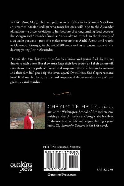 In 1942, Anna Morgan breaks a promise to her father and sets out on Napoleon, an untamed Arabian stallion who takes her on a wild ride to the Alexander plantation-a place forbidden to her because of a longstanding feud between the Morgan and Alexander families. Anna's adventure leads to the discovery of a valuable pendant-part of a stolen treasure that André Alexander brought to Oakwood, Georgia, in the mid-1800s-as well as an encounter with the dashing young Justin Alexander. Despite the feud between their families, Anna and Justin find themselves drawn to each other. But they must keep their love secret, and their union will take them down a path of danger and suspense. Will the Alexander treasure and their families' greed rip the lovers apart? Or will they find forgiveness and love? Find out in this romantic and suspenseful debut novel-a tale of lust, greed . . . and murder.