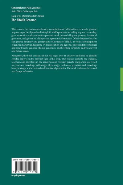 This book is the first comprehensive compilation of deliberations on whole genome sequencing of the diploid and tetraploid alfalfa genomes including sequence assembly, gene annotation, and comparative genomics with the model legume genome, functional genomics, and genomics of important agronomic characters. Other chapters describe the genetic diversity and germplasm collections of alfalfa, as well as development of genetic markers and genome-wide association and genomic selection for economical important traits, genome editing, genomics, and breeding targets to address current and future needs.