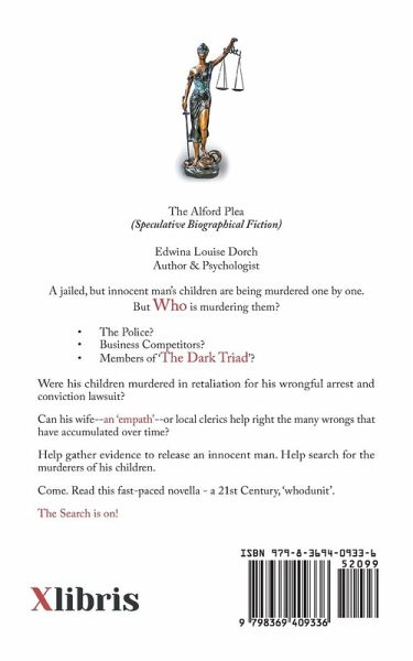 The Alford Plea (Speculative Biographical Fiction) Edwina Louise Dorch Author & Psychologist A jailed, but innocent man's children are being murdered one by one. But Who is murdering them? ¿ The Police? ¿ Business Competitors? ¿ Members of 'The Dark Triad'? Were his children murdered in retaliation for his wrongful arrest and conviction lawsuit? Can his wife--an 'empath'--or local clerics help right the many wrongs that have accumulated over time? Help gather evidence to release an innocent man. Help search for the murderers of his children. Come. Read this fast-paced novella - a 21st Century, 'whodunit'. The Search is on!