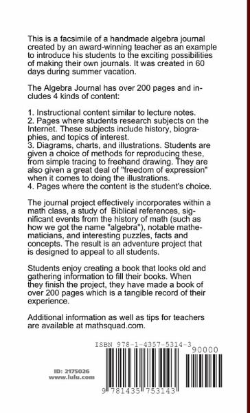 A math-can-be-fun facsimile of a completely handmade 210-page math journal. It can be used by teachers as an example to inspire students to create their own fun journals while learning math. The journal has 4 types of content: 1. Instructional content which is similar to lecture notes. 2. Pages where students research various subjects on the Internet. These pages include history, biographies, and topics of interest. 3. Diagrams, charts, and illustrations. 4. Pages of the students' choice where they select the math-related topic. Although this is an algebra journal, it can be used as an example for any subject where the teacher wants to inspire students to make a similar journal. The author, Jim Bennett, is an award-winning teacher, artist, and author. He has also written numerous other books on how to make math fun as well as books on calligraphy.