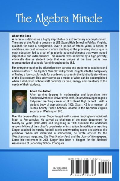 A miracle is defined as a highly improbable or extraordinary accomplishment. The story of the Algebra program at JEB Stuart High School in Fairfax, Virginia, qualifies for such a designation. Over a period of fifteen years, a series of ambitious, no-cost innovations which challenged the prevailing status quo in math education led to a set of academic accomplishments that were indeed improbable and extraordinary. This miracle was achieved by a high-poverty, ethnically diverse student body that was unique at the time but is now representative of schools found throughout the U.S. For everyone touched by education from parents and students to teachers and administrators, "The Algebra Miracle" will provide insights into the complexity of finding a low-cost formula for academic success in the tight budgetary times of the 21st century. This story serves as a model of what can be accomplished when a dedicated school staff commits its time, energy and creativity to the needs of their students.