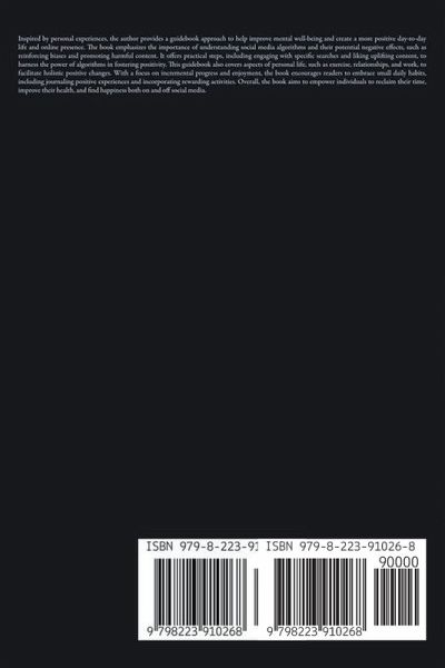 Inspired by personal experiences, the author provides a guidebook approach to help improve mental well-being and create a more positive day-to-day life and online presence. The book emphasizes the importance of understanding social media algorithms and their potential negative effects, such as reinforcing biases and promoting harmful content. It offers practical steps, including engaging with specific searches and liking uplifting content, to harness the power of algorithms in fostering positivity. This guidebook also covers aspects of personal life, such as exercise, relationships, and work, to facilitate holistic positive changes. With a focus on incremental progress and enjoyment, the book encourages readers to embrace small daily habits, including journaling positive experiences and incorporating rewarding activities. Overall, the book aims to empower individuals to reclaim their time, improve their health, and find happiness both on and off social media.