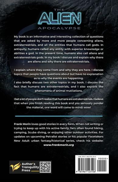My book is an informative and interesting collection of questions that are asked by more and more people concerning aliens, extraterrestrials, and all the entities that humans call gods. In antiquity, humans called any entity with superior knowledge or abilities a god. In the present time, humans also call aliens and extraterrestrials gods. In my book I discuss and explain why there are aliens and why there are extraterrestrials.I explain where they come from and why they are here. I discuss topics that people have questions about but have no explanation as to why the events are happening.I also briefly discuss two other topics in my book. I discuss the fact that humans are extraterrestrials, and I also explore the phenomena of animal mutilations.I bet a lot of people don't realize that humans are extraterrestrials. I believe that when you finish reading this book and you seriously ponder the material, one word will come to mind: wow!