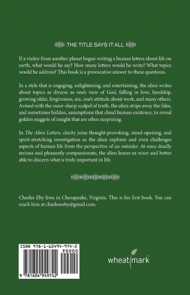 If a visitor from another planet began writing a human letters about life on earth, what would he say? How many letters would he write? What topics would he address? This book is a provocative answer to these questions. In a style that is engaging, enlightening, and entertaining, the alien writes about topics as diverse as one's view of God, falling in love, hardship, growing older, forgiveness, sex, one's attitude about work, and many others. Armed with the razor-sharp scalpel of truth, the alien strips away the false, and sometimes hidden, assumptions that cloud human existence, to reveal golden nuggets of insight that are often surprising. In The Alien Letters, clarity joins thought-provoking, mind-opening, and spirit-stretching investigation as the alien explores and even challenges aspects of human life from the perspective of an outsider. At once deadly serious and pleasantly compassionate, the alien leaves us wiser and better able to discern what is truly important in life. About the Author Charles Eby lives in Chesapeake, Virginia. This is his first book. You can reach him at charleseeby@gmail.com.