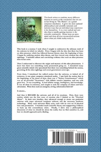 This book is a journey I took where I sought to undercover the ultimate truth of the universe in which we inhabit. First, I began with the idea that there has been an alien presence which has followed human history since the beginning of time. I began by outlining ancient alien theory, and then moved onto modern day alien sightings. I knew that there was something vastly paranormal going on. I chronicled many great scientific minds who speculated that there was something behind the scenes. From there, I introduced the radical notion that the universe, or indeed all of existence, is one giant computer simulated reality. I put forth the notion that in the beginning, at the dawn of time, there was a "Source Consciousness" which was an all powerful "Awareness" with infinite creative impulses, and one with great love. It had infinite energy, intelligence, and knowledge. It was all alone in existence, and sought to have something to love and to seek adventures. Thus, it created the universe. And so came us.