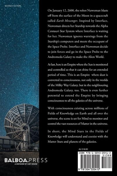 On January 12, 2600, the robot Nuwoman blasts off from the surface of the Moon in a spacecraft called Earth Messenger. Inspired by Interface, Nuwoman directs her Starship towards the Alpha Centauri Star System where Interface is waiting for her. Nuwoman ignores warnings from the Starship's computers and meets the occupant of the Space Probe. Interface and Nuwoman decide to join forces and go in the Space Probe to the Andromeda Galaxy to make the Alien World. At last, here is an Empire where the Sun is monitored and controlled so that it can shine for an extended period of time. This is an Empire where dust is converted to consciousness, not only in the worlds of the Milky Way Galaxy, but in the neighbouring Andromeda Galaxy, too. There is even further potential to extend the Empire by bringing consciousness to all the galaxies of the universe. With consciousness existing across millions of Fields of Knowledge on Earth and all over the universe, the scene is set for Mind to monitor and control the vast resources of Matter in the universe. In short, the Mind Stars in the Fields of Knowledge will understand and coexist with the Matter Stars and planets of the galaxies.