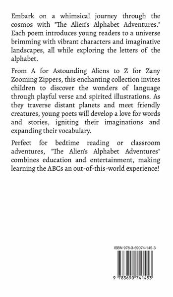 Embark on a whimsical journey through the cosmos with "The Alien's Alphabet Adventures." Each poem introduces young readers to a universe brimming with vibrant characters and imaginative landscapes, all while exploring the letters of the alphabet. From A for Astounding Aliens to Z for Zany Zooming Zippers, this enchanting collection invites children to discover the wonders of language through playful verse and spirited illustrations. As they traverse distant planets and meet friendly creatures, young poets will develop a love for words and stories, igniting their imaginations and expanding their vocabulary. Perfect for bedtime reading or classroom adventures, "The Alien's Alphabet Adventures" combines education and entertainment, making learning the ABCs an out-of-this-world experience!