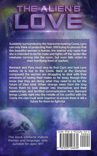Suddenly surrounded by the fearsome-looking Covra, Lynx can only think of protecting Rain. Still trying to process that this beautiful woman is human, the warrior only cares that she is intended to be his mate and fights off the spider-like creatures coming into the room, but soon falls victim to their horrifying form of warfare. Bannack and Pyra must race to find Ciyrs and heal Lynx before he is lost to the Covra. Back at the Denynso compound the women are struggling to deal with their emotions of having their mates so far away, though they know that they are doing what they need to do for the future of their kind. When strange news from the king forces them to look deeper into themselves and their relationships, and terrified communication from Bannack brings Loralia right into the middle of the conflict with the Covra, the clan must work together to ensure there is still a future for them to fight for