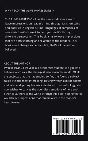 THE ALIVE IMPRESSIONS, as the name indicates aims to leave impressions on the reader's mind through its short tales and poetries in English and Hindi languages. It comprises nine varied writer's work to help you see life through different perspectives. This book aims to lead impressions that are both soothing and relatable to the readers. This book could change someone's life. That's all the author believes!