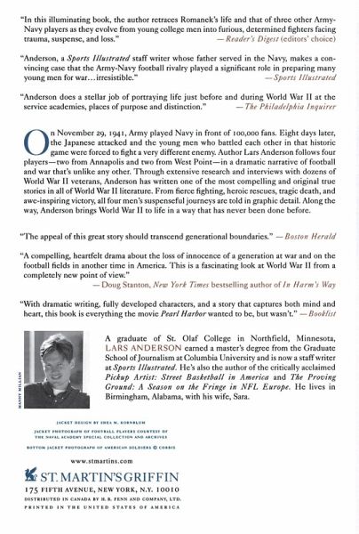 On November 29, 1941, Army played Navy in front of 100,000 fans. Eight days later, the Japanese attacked and the young men who battled each other in that historic game were forced to fight a very different enemy. Author Lars Anderson follows four players-two from Annapolis and two from West Point-in this epic true story, The All Americans. Bill Busik. Growing up in Pasadena, California, Busik was best friends with a young black man named Jackie, who in 1947 would make Major League Baseball history. Busik would have a spectacular sports career himself at the Naval Academy, earning All-American honors as a tailback in 1941. He was serving aboard the U.S.S. Shaw when it was attacked by Japanese dive-bombers in 1943. Hal Kauffman. Together, Busik and Kauffman rode a train across the nation to Annapolis to enroll in the Naval Academy. A backup tailback at Navy, Kauffman would go on to serve aboard the U.S.S. Meredith, which was sunk in 1942. For five days Kauffman struggled to stay alive on a raft, fighting off hallucinations, dehydration, and-most terrifying of all-sharks. Dozens of his crewmates lost their minds; others were eaten by sharks. All the while Kauffman wondered if he'd ever see his friend and teammate again. Henry Romanek. Because he had relatives in Poland, Romanek heard firsthand accounts in 1939 of German aggression. Wanting to become an officer, Romanek attended West Point and played tackle for the Cadets. He spent months preparing for the D-day invasion and on June 6, 1944-the day he would have graduated from West Point had his course load not been cut from four years to three-Romanek rode in a landing craft to storm Omaha Beach. In the first wave to hit the beach he would also become one of the first to take a bullet. Robin Olds. The son of a famous World War I fighter pilot, Olds decided to follow in his father's footsteps. At West Point he became best friends with Romanek and the two played side-by-side on Army's line. In 1942, a sportswriter Grantland Rice named Olds to his All-American team. Two years later Olds spent D-day flying a P-38 over Omaha Beach, anxiously scanning the battlefield for Romanek, hoping his friend would survive the slaughter. The tale of these four men is woven into a dramatic narrative of football and war that's unlike any other. Through extensive research and interviews with dozens of World War II veterans, Anderson has written one of the most compelling and original true stories in all of World War II literature. From fierce fighting, heroic rescues, tragic death, and awe-inspiring victory, all four men's suspenseful journeys are told in graphic detail. Along the way, Anderson brings World War II to life in a way that has never been done before. Includes sixteen pages of black-and-white photographs.