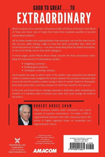 Extraordinary leaders share a passionate commitment to achieving their vision that borders and sometimes crosses the line into obsession. All In shows why obsession, if properly focused and managed, is both necessary and productive. Advances in any endeavor almost always depend on a small group of individuals who are completely consumed by the goal they're pursuing. When these leaders and teams are successful, everyone benefits from their obsessive nature. This book?explores the three obsessions underlying the achievements of the greatest leaders: delighting customers, building great products, and creating an enduring company. Author Robert Bruce Shaw takes you inside the success stories of iconic leaders and shows the upside of obsession plus the practices that support it, including Jeff Bezos of Amazon, Elon Musk of Tesla, and Steve Jobs of Apple. In All In, Shaw teaches you why: Amazon's first principle is customer obsession and the behaviors that sustain it as the firm becomes one of the largest in the world. Tesla puts products at the center of everything it does and the leadership approach that created a revolutionary electric car. Steve Jobs' greatest creation was not the Mac or iPhone but Apple the company. ? ? ? ? ? ? ? Shaw also provides insight into the dark side of obsession and its destructive potential - as vividly illustrated in his case study of Uber's aggressive pursuit of growth during the tenure of CEO Travis Kalanick. Appealing to any reader of entrepreneurial biographies, All In shows individuals, teams and organizations how to manage obsession's downsides while realizing the benefits of relentlessly seeking to create something that truly matters.