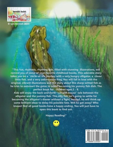 Dive into the delightful world of The Alligator and his Yummy Fish Dish,' a charming children's book that unfolds the hilarious escapades of a ravenous alligator and a quick-witted fish. Join our hungry alligator protagonist as he sets his sights on a clever fish for his next meal. Little does he know, this fish is no ordinary fish; armed with intelligence and a knack for evading danger, the clever fish turns the tables on the hungry alligator at every twist and turn. In this whimsical tale of wit and humor, young readers will be captivated by the clever fish's ingenious strategies to outsmart the persistent alligator. The fish keeps readers on the edge of their seats, wondering how he will outsmart the hungry predator next. But hold on tight, because in a surprising turn of events, the alligator's insatiable appetite takes an unexpected twist. As the story reaches its climax, a comical encounter with a frog leads to an amusing and unexpected conclusion. 'The Alligator and his Yummy Fish Dish' is not just a tale of survival but a heartwarming story that teaches young readers about quick thinking, and the unpredictable nature of life in the wild. With vibrant illustrations and a lively narrative, this picture book is perfect for preschoolers and early elementary readers. 'The Alligator and his Yummy Fish Dish' is an engaging and laughter-filled adventure that will leave children eagerly turning the pages to discover the fate of our clever fish. This fun, rhythmic, rhyming tale filled with stunning illustrations will remind you of some of your favorite childhood books. This adorable book takes you on a circle of life journey with a very hungry alligator, a clever little fish, and a very unfortunate purple frog. You will fall in love with the original, vibrant illustrations and story about this sharp-witted fish as he tries to outsmart the gator to avoid becoming his yummy fish dish. The perfect book for children ages 2 -8. The kids will enjoy the back and forth "cat and mouse" tale that this book delivers. This little fish isn't going to settle for becoming the alligator's dinner without a fight, instead he will think up some brilliant ideas to delay his possible fate. Will he get away? Who knows! Not all good books have a happy ending. You will just have to open this book to find out! Happy Reading!