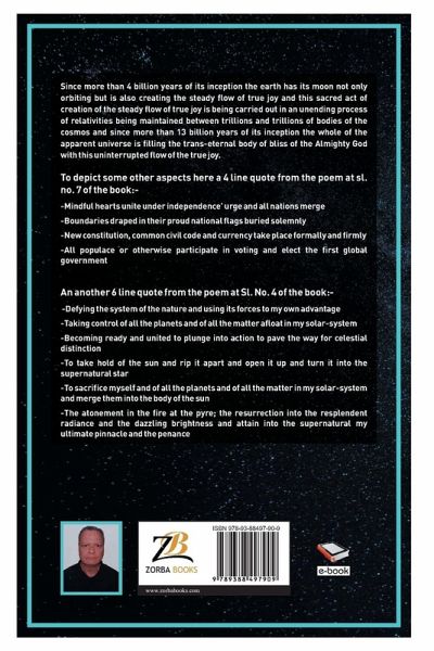 The earth has its moon not only orbiting but is uninterruptedly creating a steady flow of true joy for the past 3 billion years since its inception. This process of creation of a steady flow of true joy is being magnified by the relativities being created trillions and trillions of bodies in the cosmos. In an unending continuous process the whole cosmos has been creating a steady flow of true joy for the past 7 billion years of its inception and is continuously filling the trans-eternal body of bliss of the almighty-god. To depict some other aspects here a 4 line quote from page. - Mindful hearts unite under independence urge and all nations merge - Boundaries draped in their proud flags buried solemnly - New constitution, common civil code and currency take place formally and firmly - All populace or otherwise participate in voting and elect the first global government The earth is saying - Defying the system of nature and using its forces to my own advantage - Taking control of all the planets and of all the matter afloat in my solar-system - Becoming ready and united to plunge into action to pave the way for celestial distinction - To take hold of the sun and rip it apart and open it up and turn it into the supernatural distinction - To take hold of the sun and rip it apart and open it up and turn it into the supernatural star - To sacrifice myself and of all the planets and of all the matter in my solar-system and merge them into the body of the sun - The atonement in the fire at the pyre; the resurrection into the resplendent radiance and the dazzling brightness and attain into the supernatural my ultimate pinnacle and the penance