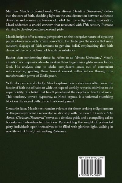 Matthew Mead's profound work, "The Almost Christian Discovered," delves into the core of faith, shedding light on the vital distinction between authentic devotion and a mere profession of belief. In this enlightening exploration, Mead addresses a crucial concern that resonated with 17th-century Puritans striving to develop genuine personal piety. Mead's insights offer a crucial perspective on the deceptive nature of equating public observance with private conviction. He challenges the notion that mere outward displays of faith amount to genuine belief, emphasizing that faith devoid of deep conviction holds no true substance. Rather than condemning those he refers to as "almost Christians," Mead's intention is compassionate-to awaken them to genuine righteousness before God. His analysis aims to shake complacent souls out of convenient self-deception, guiding them toward earnest self-reflection through the transformative power of God's grace. With eloquence and clarity, Mead explains how individuals often wear the facade of faith out of habit or with the hope of worldly rewards, oblivious to the superficiality of a belief that hasn't penetrated the depths of heart and mind. This tendency toward hypocrisy, as Mead argues, is a universal stumbling block on the sacred path of spiritual development. Centuries later, Mead's text remains relevant for those seeking enlightenment on the journey toward a reconciled relationship with the merciful Creator. "The Almost Christian Discovered" serves as a timeless guide and a compelling call to honesty and wholehearted devotion. By shedding the weight of pretended piety, individuals open themselves to be filled with glorious light, walking in new life with Christ, their waiting Redeemer.