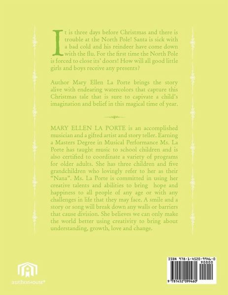 It is three days before Christmas and there is trouble at the North Pole! Santa is sick with a bad cold and his reindeer have come down with the flu. For the first time the North Pole is forced to close its' doors! How will all good little girls and boys receive any presents? Author Mary Ellen La Porte brings the story alive with endearing watercolors that capture this Christmas tale that is sure to capivate a child's imagination and belief in this magical time of year.