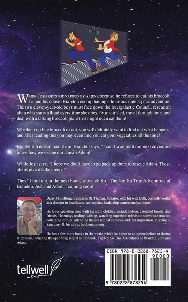 WHEN JOSH GETS KIDNAPPED BY ALIENS because he refuses to eat his broccoli, he and his cousin Brandon end up having a hilarious outer-space adventure. The two eleven-year-old boys must face down the Intergalactic Council, rescue an alien who starts a flood every time she cries, fly an air sled, travel through time, and deal with a talking broccoli plant that might even eat them! Whether you like broccoli or not, you will definitely want to find out what happens, and after reading this you may even find you eat your vegetables all the time! But the fun doesn't end there. Brandon says, "I can't wait until our next adventure to see how we rescue our cousin Adam!" While Josh says, "I hope we don't have to go back up there to rescue Adam. Those aliens give me the creeps!" They'll find out in the next book, so watch for "The Not So True Adventures of Brandon, Josh and Adam," coming soon!