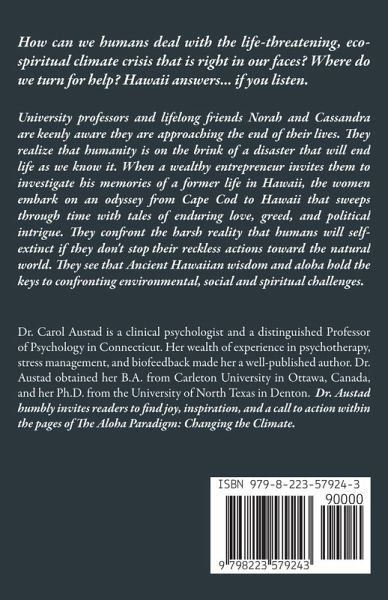 Who can we humans ask for help to deal with the life-threatening, eco-spiritual climate crisis that is right in our faces? Hawaii answers… if you listen. Norah and Cassandra, longtime friends, and esteemed university professors, believe that human's self-destructive actions towards the environment are leading to humanity's demise. Recognizing that they are in the twilight of their careers and their time on Earth, both women's lives take an unexpected turn when a wealthy entrepreneur invites them to uncover his purported past life. They are propelled onto a transformative odyssey ranging from Cape Cod to Hawaii. They encounter stories of love, greed, and political intrigue and finally come to the profound realization that embracing the ancient Hawaiian wisdom of aloha is the key to human survival on our planet.