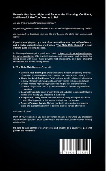 UNLEASH YOUR INNER ALPHA AND BECOME THE CHARMING, CONFIDENT, AND POWERFUL MAN YOU DESERVE TO BE! Are you tired of lackluster dating experiences? Do you struggle with low self-confidence and understanding what women truly desire? Are you ready to transform your love life and become the alpha man women can't resist? If you've been plagued by a lack of success with women, low self-confidence, and a limited understanding of attraction, "The Alpha Male Blueprint" is your ultimate guide to dating success. In this comprehensive guide, you'll learn how to unleash your inner alpha and master the art of confidence. With practical strategies and techniques, you'll navigate the dating scene with ease, make powerful first impressions, and build emotional connections that leave a lasting impact. In "The Alpha Male Blueprint," you will: -Unleash Your Inner Alpha: Develop an alpha mindset, embodying the traits of confidence, assertiveness, and charisma that make women chase you. -Master the Art of Confidence: Build unshakable self-confidence that radiates in every interaction, allowing you to approach women with ease and charm. -Decode Female Psychology: Gain deep insights into the female mind, understanding what women truly desire and how to create strong emotional connections. -Become Irresistible: Learn proven flirting and seduction techniques that drive women wild, making you irresistible in their eyes. -Navigate the Dating Scene: Discover effective dating strategies and make powerful first impressions that leave a lasting impact on women. -Achieve Personal Growth: Nurture your body, mind, and soul, managing stress and overcoming burnout to become the best version of yourself. And so much more! Don't let your doubts hold you back any longer. Imagine a life where you effortlessly attract romantic partners, exude confidence in every situation, and build deep, fulfilling relationships. IT'S TIME TO TAKE CONTROL OF YOUR LOVE LIFE AND EMBARK ON A JOURNEY OF PERSONAL GROWTH AND FULFILLMENT BY GRABBING A COPY!