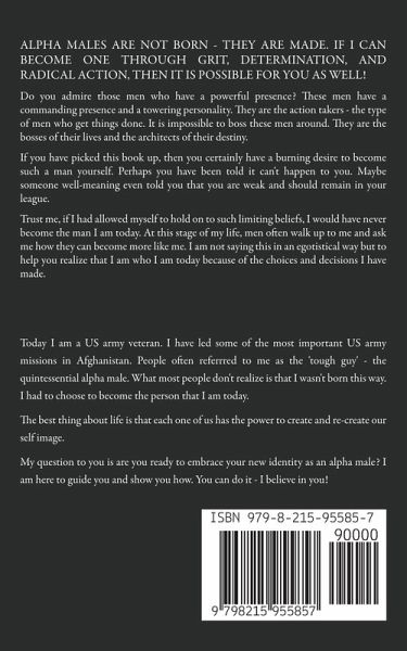 ALPHA MALES ARE NOT BORN - THEY ARE MADE. IF I CAN BECOME ONE THROUGH GRIT, DETERMINATION, AND RADICAL ACTION, THEN IT IS POSSIBLE FOR YOU AS WELL! Do you admire those men who have a powerful presence? These men have a commanding presence and a towering personality. They are the action takers - the type of men who get things done. It is impossible to boss these men around. They are the bosses of their lives and the architects of their destiny. If you have picked this book up, then you certainly have a burning desire to become such a man yourself. Perhaps you have been told it can't happen to you. Maybe someone well-meaning even told you that you are weak and should remain in your league. Trust me, if I had allowed myself to hold on to such limiting beliefs, I would have never become the man I am today. At this stage of my life, men often walk up to me and ask me how they can become more like me. I am not saying this in an egotistical way but to help you realize that I am who I am today because of the choices and decisions I have made. I could have chosen to remain that fearful skinny boy I once was who could barely hold eye contact for more than a few seconds. I made a different choice. I decided that I wanted to become strong. I knew I wanted to become the type of man that society describes as the 'alpha male.' I have spent a lot of time studying the life and habits of alpha males I admired. Slowly, I started incorporating those some characteristics and habits into my own personality and life. It wasn't an easy transition and I did have many moments of self-doubt. Yet I remained committed to this new self-image I was working so hard to build. Today I am a US army veteran. I have led some of the most important US army missions in Afghanistan. People often referrred to me as the 'tough guy' - the quintessential alpha male. What most people don't realize is that I wasn't born this way. I had to choose to become the person that I am today. The best thing about life is that each one of us has the power to create and re-create our self image. My question to you is are you ready to embrace your new identity as an alpha male? I am here to guide you and show you how. You can do it - I believe in you!