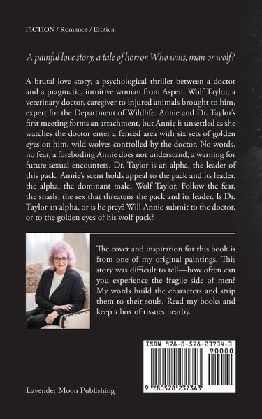 A brutal love story, a psychological thriller, The Alpha is a twisting page-turner about a doctor and a pragmatic, intuitive woman. Follow the fear, the snarls, the sex that threatens the pack and its leader. Is Dr. Taylor an alpha, or is he prey? Will Annie submit to the doctor or to the golden eyes of his wolf pack? Inspired by a painting of a wolf, Katherine Zartman's novel is a unique love story: about a man, a woman, and wolves-and the conflict and connection between them all.