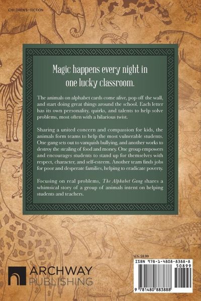Magic happens every night inone lucky classroom. The animals on alphabet cards come alive, pop off the wall, and start doing great things around the school. Each letter has its own personality, quirks, and talents to help solve problems, most often with a hilarious twist. Sharing a united concern and compassion for kids, the animals form teams to help the most vulnerable students. One gang sets out to vanquish bullying, and another works to destroy the stealing of food and money. One group empowers and encourages students to stand up for themselves with respect, character, and self-esteem. Another team finds jobs for poor and desperate families, helping to eradicate poverty. Focusing on real problems, The Alphabet Gang shares a whimsical story of a group of animals intent on helping students and teachers.