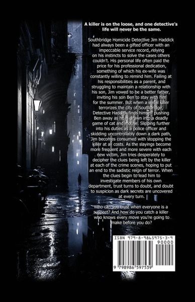 A killer is on the loose, and one detective's life will never be the same. Southbridge Homicide Detective Jim Haddick had always been a gifted officer with an impeccable service record, relying on his instincts to solve the cases others couldn't. His personal life often paid the price for his professional dedication, something of which his ex-wife was constantly willing to remind him. Failing at his responsibilities as a parent, and struggling to maintain a relationship with his son, Jim vowed to be a better father, inviting his son Ben to stay with him for the summer. But when a serial killer terrorizes the city of Southbridge, Detective Haddick finds himself pushing Ben away as he is drawn into a deadly game of cat and mouse. Slipping further into his duties as a police officer and skidding uncontrollably down a dark path, Jim becomes consumed with stopping the killer at all costs. As the slayings become more frequent and more severe with each new victim, Jim tries desperately to decipher the clues being left by the killer at each of the crime scenes, hoping to put an end to the sadistic reign of terror. When the clues begin to lead him to investigate members of his own department, trust turns to doubt, and doubt to suspicion as dark secrets are uncovered at every turn. Who can you trust when everyone is a suspect? And how do you catch a killer who knows every move you're going to make before you do?