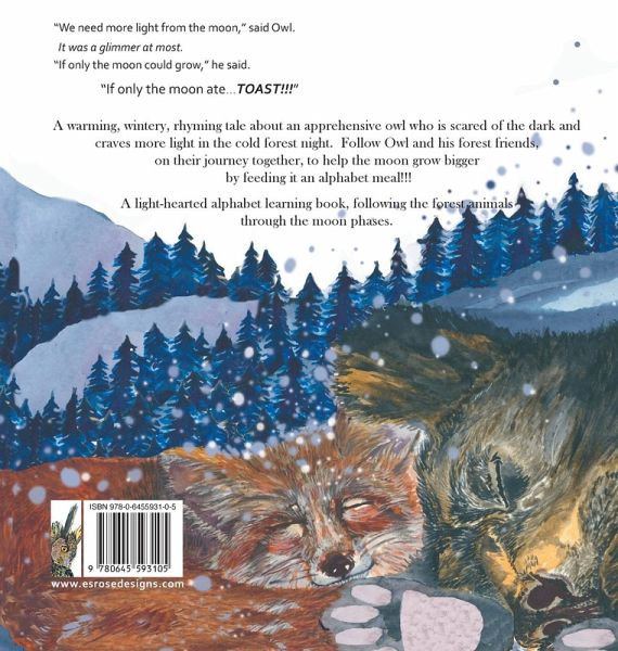 Have you ever been afraid of the dark? What if you were a nocturnal Owl who was afraid of the dark and decided, with the help of your forest friends, you could conquer your fears and create more light in the world? "We need more light from the moon," said Owl. It was a glimmer at most. "If only the moon could grow," he said. "If only the moon ate...TOAST!!!" The Alphabet Moon is a warming, wintery, rhyming tale about an apprehensive owl who is scared of the dark and craves more light in the cold forest night. Follow Owl and his forest friends, on their journey together, to help the moon grow bigger by feeding it an alphabet meal!!! A light-hearted alphabet learning book, following the forest animals through the moon phases.