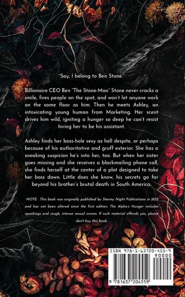 "Say, I belong to Ben Stone." Billionaire CEO Ben "The Stone-Man" Stone never cracks a smile, fires people on the spot, and won't let anyone work on the same floor as him. Then he meets Ashley, an intoxicating young human from Marketing. Her scent drives him wild, igniting a hunger so deep he can't resist hiring her to be his assistant. Ashley finds her boss-hole sexy as hell despite, or perhaps because of his authoritative and gruff exterior. She has a sneaking suspicion he's into her, too. But when her sister goes missing and she receives a blackmailing phone call, she finds herself at the center of a plot designed to take her boss down. Little does she know, his secrets go far beyond his brother's brutal death in South America. NOTE: This book was originally published by Stormy Night Publications in 2015 and has not been altered since the first edition. The Alpha's Hunger includes spankings and rough, intense sexual scenes. If such material offends you, please don't buy this book.