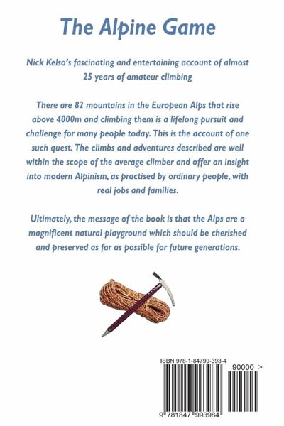 Nick Kelso's fascinating and entertaining account of 25 years of amateur climbing in the Alps. There are 82 mountains in the European Alps that rise above 4000m and climbing them all is a lifelong persuit and challenge for many people today. This is the account of one such quest. The climbs and adventures described are well within the scope of the average climber and offer an insight into modern Alpinism, as practised by ordinary people with real jobs and families