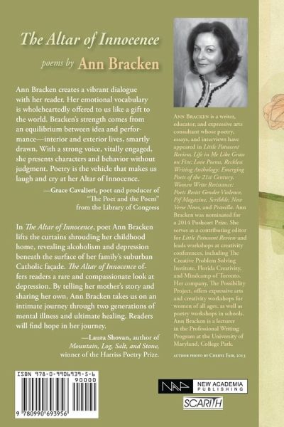 The poems in this volume, based on events in the author's life, explore the 1960s culture of secrecy surrounding alcoholism and depression and their effects on herself as a young girl. "Ann Bracken creates a vibrant dialogue with her reader. Her emotional vocabulary is wholeheartedly offered to us like a gift to the world. Bracken's strength comes from an equilibrium between idea and performance-interior and exterior lives, smartly drawn. With a strong voice, vitally engaged, she presents characters and behavior without judgment. Poetry is the vehicle that makes us laugh and cry at her "Altar of Innocence." -Grace Cavalieri, poet and producer of the radio show "The Poet and the Poem from the Library of Congress" "The Altar of Innocence offers readers a rare and compassionate look at depression. By telling her mother's story and sharing her own, Ann Bracken takes us on an intimate journey through two generations of mental illness and ultimate healing. Readers will find hope in her journey." - Laura Shovan, writer and publisher of Little Patuxant Review