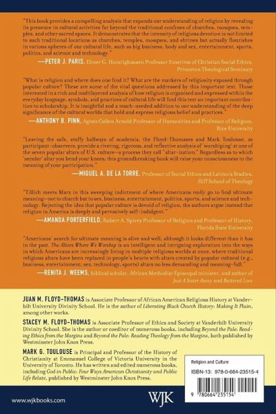 While a large percentage of Americans claim religious identity, the number of Americans attending traditional worship services has significantly declined in recent decades. Where, then, are Americans finding meaning in their lives, if not in the context of traditional religion? In this provocative study, the authors argue that the objects of our attention have become our god and fulfilling our desires has become our religion. They examine the religious dimensions of six specific aspects of American culture-body and sex, big business, entertainment, politics, sports, and science and technology-that function as "altars" where Americans gather to worship and produce meaning for their lives. The Altars Where We Worship shows how these secular altars provide resources for understanding the self, others, and the world itself. "For better or worse," the authors write, "we are faced with the reality that human experiences before these altars contain religious characteristics in common with experiences before more traditional altars." Readers will come away with a clearer understanding of what religion is after exploring the thoroughly religious aspects of popular culture in the United States.