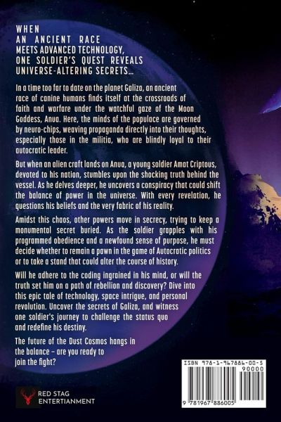 A tyrant's command. An alien mystery. One soldier caught in a war he never chose. On the planet Galiza, obedience is coded into the mind. Half-wolf, half-human, its people march beneath the Moon Goddess' gaze, their loyalty enforced by neuro-chips that feed propaganda straight into their thoughts. For 15 year old soldier Amat Criptous, service to the autocratic dictator isn't a choice-it's hardwired. But everything changes when an alien vessel ominously lands on the moon. Silent. Alluring. Terrifying in its mystery. Compelled by the dictator's ruthless orders, Amat is forced into skirmishes with the visitors, each clash pushing him further into a web of secrets that have long been suppressed. Torn between his programmed obedience and the truths he uncovers, Amat must decide if he is willing to remain a pawn in the tyrant's game-or risk everything to defy him. The choices he makes will ripple across the universe, shaking faith, loyalty, and the fragile balance of power in the Dust Cosmos. Fast-paced, action-packed, and layered with conspiracy, The Altered Moon is the explosive first entry in a military sci-fi saga where faith collides with technology, and one soldier's awakening may ignite a revolution among the stars. Fans of The Expanse, Warhamer 40K, Halo, Ender's Game, and The Ember War will love it!