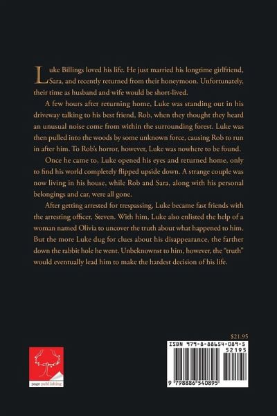 Luke Billings loved his life. He just married his longtime girlfriend, Sara, and recently returned from their honeymoon. Unfortunately, their time as husband and wife would be short-lived. A few hours after returning home, Luke was standing out in his driveway talking to his best friend, Rob, when they thought they heard an unusual noise come from within the surrounding forest. Luke was then pulled into the woods by some unknown force, causing Rob to run in after him. To Rob's horror, however, Luke was nowhere to be found. Once he came to, Luke opened his eyes and returned home, only to find his world completely flipped upside down. A strange couple was now living in his house, while Rob and Sara, along with his personal belongings and car, were all gone. After getting arrested for trespassing, Luke became fast friends with the arresting officer, Steven. With him, Luke also enlisted the help of a woman named Olivia to uncover the truth about what happened to him. But the more Luke dug for clues about his disappearance, the farther down the rabbit hole he went. Unbeknownst to him, however, the "truth" would eventually lead him to make the hardest decision of his life.