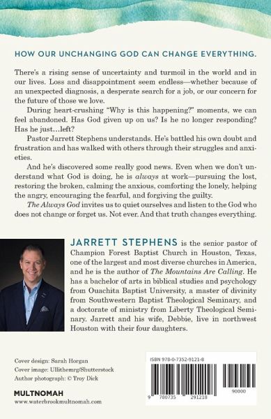 A message of hope for an anxious day: God never changes. He is still here and ready to transform our lives. What we must ask is if we are ready to respond to him. The influential teaching pastor of one of America's largest megachurches calls out a common feeling: It's easy to wonder if God has just... left. There is a rising sense of uncertainty and turmoil in the world. Our individual lives are often touched by disappointment, confusion, or regret. Sometimes, if we're honest, we can even feel abandoned by God. Pastor Jarrett Stephens has been there, engaging personal doubt and frustration, and learning how to walk with others through their own anxieties into a better future. Throughout Scripture, God reveals himself using various names to describe his nature and character. Each tells us something fascinating about his character. The eternal name God chose to use when revealing himself to Moses at the burning bush was "I AM," indicating how, while others change, God does not. Centuries later, Jesus ascribed this title to himself, giving seven distinct "I AM" statements, which help us see how the "I AM" from the past is still the "I AM" today. This unfailing, good nature of the always God helps us find solid footing in a shifting world. The Always God gives hope to those who think God has given up on us or is no longer responding. It invites us to quiet ourselves and listen to the God who does not change or forget us. Not ever. And that changes everything.