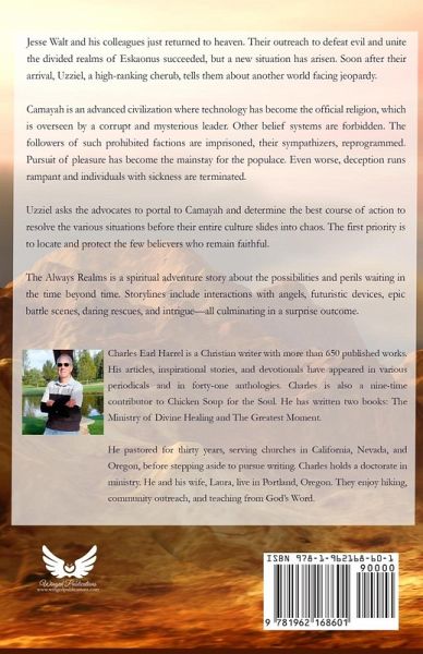 Jesse Walt and his colleagues just returned to heaven. Their outreach to defeat evil and unite the divided realms of Eskaonus succeeded, but a new situation has arisen. Soon after their arrival, Uzziel, a high-ranking cherub, tells them about another world facing jeopardy. Camayah is an advanced civilization where technology has become the official religion, which is overseen by a corrupt and mysterious leader. Other belief systems are forbidden. The followers of such prohibited factions are imprisoned, their sympathizers, reprogrammed. Pursuit of pleasure has become the mainstay for the populace. Even worse, deception runs rampant and individuals with sickness are terminated. Uzziel asks the advocates to portal to Camayah and determine the best course of action to resolve the various situations before their entire culture slides into chaos. The first priority is to locate and protect the few believers who remain faithful. The Always Realms is a spiritual adventure story about the possibilities and perils waiting in the time beyond time. Storylines include interactions with angels, futuristic devices, epic battle scenes, daring rescues, and intrigue-all culminating in a surprise outcome.