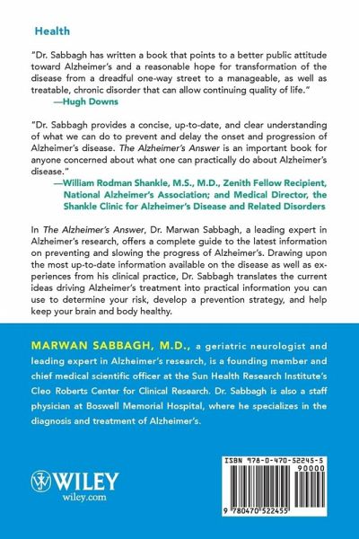 A front-line researcher offers cutting-edge advice on preventing and slowing the progress of Alzheimer's Drawing on the most up-to-date information available on the disease as well as experiences from his clinical practice, Dr. Marwan Sabbagh, a leading expert in Alzheimer's research, translates the current ideas driving Alzheimer's treatment into practical information you can use to determine your risk and develop a prevention strategy. You'll find tools for assessing your personal Alzheimer's risk and ""What You Can Do"" sections to help you keep your brain and body healthy, plus information on the treatment of Alzheimer's and its complications.Gives you the most up-to-date information on Alzheimer's and Alzheimer's prevention Written by a neurologist specializing in geriatric neurology and dementia who is one of the country's leading experts in Alzheimer's research Includes exciting revelations, such as finding that early onset Alzheimer's can be significantly slowed in its progress, giving the patient as many as ten to fifteen added years of quality life There are an estimated 5.2 million people living with Alzheimer's in America today. If you or someone you love is at risk of developing the disease or wishes to slow its advancement, this book will give you vital information to help you reduce risk and safeguard health and quality of life.