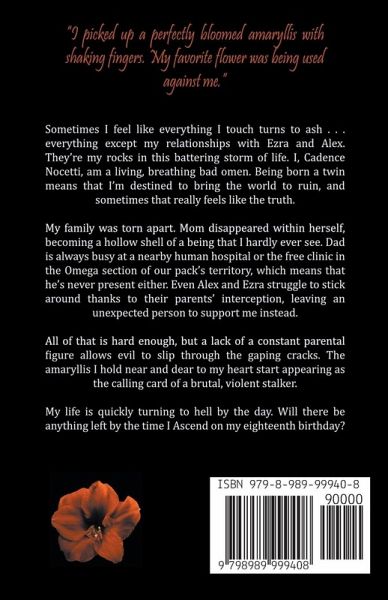 Sometimes I feel like everything I touch turns to ash . . . everything except my relationships with Ezra and Alex. They're my rocks in this battering storm of life. I, Cadence Nocetti, am a living, breathing bad omen. Being born a twin means that I'm destined to bring the world to ruin, and sometimes that really feels like the truth. My family was torn apart. Mom disappeared within herself, becoming a hollow shell of a being that I hardly ever see. Dad is always busy at a nearby human hospital or the free clinic in the Omega section of our pack's territory, which means that he's never present either. Even Alex and Ezra struggle to stick around thanks to their parents' interception, leaving an unexpected person to support me instead. All of that is hard enough, but a lack of a constant parental figure allows evil to slip through the gaping cracks. The amaryllis I hold near and dear to my heart start appearing as the calling card of a brutal, violent stalker. My life is quickly turning to hell by the day. Will there be anything left by the time I Ascend on my eighteenth birthday?
