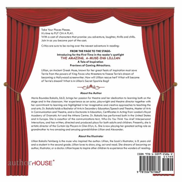 Take your places please. It's time to put on a play. Critics are sure to be raving over the newest adventure in reading-From the Page to the Stage-introducing for the first time in the reader's spotlight: THE AMAZING, A-MUSE-ING LILLIAN A tale of inspiration, previews of coming attractions. Lillian, an ancient Greek muse known for her great feats of inspiration, must save Terrie from the powers of King Fovos, who threatens to freeze Terrie's dream of becoming a Hollywood screenwriter. How will Lillian rescue her? What will become of Terrie's dream? What is in Lillian's Secret Sparkle Bag? With a cast of characters that promise you adventure, laughter, thrills, and chills, join in as you become part of the cast. On with the show!