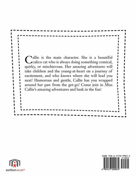 Callie is the main character. She is a beautiful calico cat who is always doing something comical, quirky, or mischievous. Her amazing adventures will take children and the young-at-heart on a journey of excitement, and who knows where she will lead you next! Humorous and gentle, Callie has you wrapped around her paw from the get-go! Come join in Miss Callie's amazing adventures and bask in the fun!