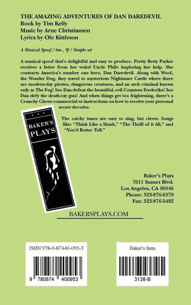 Book by Tim Kelly Music and Lyrics by Arne Christiansen and Ole Kittleson A Musical Spoof of Radio's Golden Age Characters: 6 male, 9 female. One simple set A musical spoof that's delightful and easy to produce. Pretty Betty Parker receives a letter from her weird Uncle Philo imploring her help. She contracts America's number one hero, Dan Daredevil. Along with Woof, the Wonder Dog, they travel to mysterious Nightmare Castle where there are modern-day pirates, dangerous creatures, and an arch criminal known only as The Fog! See Dan defeat the beautiful, evil Countess Frederika! See Dan defy the death-ray gun! And when things get too frightening, there's a Crunchy Chews commercial or instructions on how to receive your personal secret decoder. The catchy tunes are easy to sing, but clever. Songs like: "Think Like a Shark," "The Thrill of it All," "You'd Better Tell." Suitable for all groups, from school to dinner theatre.