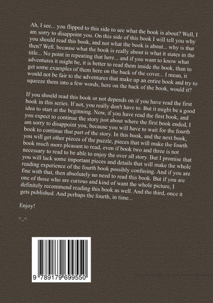 Ah, I see... you flipped to this side to see what the book is about? Well, I am sorry to disappoint you. On this side of this book I will tell you why you should read this book, and not what the book is about... why is that then? Well, because what the book is really about is what it states in the title... No point in repeating that here... and if you want to know what adventures it might be, it is better to read them inside the book, than to get some examples of them here on the back of the cover... I mean, it would not be fair to the adventures that make up an entire book and try to squeeze them into a few words, here on the back of the book, would it?If you should read this book or not depends on if you have read the first book in this series. If not, you really don't have to. But it might be a good idea to start at the beginning. Now, if you have read the first book, and you expect to continue the story just about where the first book ended, I am sorry to disappoint you, because you will have to wait for the fourth book to continue that part of the story. In this book, and the next book, you will get other pieces of the puzzle, pieces that will make the fourth book much more pleasant to read, even if book two and three is not necessary to read to be able to enjoy the over all story. But I promise that you will lack some important pieces and details that will make the whole reading experience of the fourth book possibly confusing. And if you are fine with that, then absolutely no need to read this book. But if you are one of those who are curious and kind of want the whole picture, I definitely recommend reading this book as well. And the third, once it gets published.Enjoy!^..^