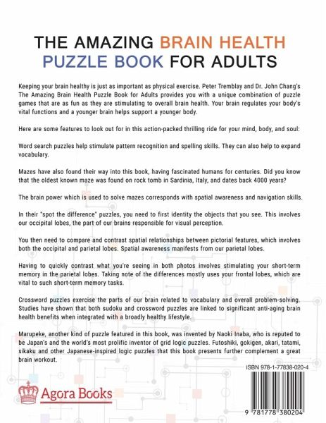 Keeping your brain healthy is just as important as physical exercise. Peter Tremblay and Dr. John Chang's The Amazing Brain Health Puzzle Book for Adults provides you with a unique combination of puzzle games that are as fun as they are stimulating to overall brain health. Your brain regulates your body's vital functions and a younger brain helps support a younger body. Here are some features to look out for in this action-packed thrilling ride for your mind, body, and soul: Word search puzzles help stimulate pattern recognition and spelling skills. They can also help to expand vocabulary. Mazes have also found their way into this book, having fascinated humans for centuries. Did you know that the oldest known maze was found on rock tomb in Sardinia, Italy, and dates back 4000 years? The brain power which is used to solve mazes corresponds with spatial awareness and navigation skills. In their "spot the difference" puzzles, you need to first identity the objects that you see. This involves our occipital lobes, the part of our brains responsible for visual perception. You then need to compare and contrast spatial relationships between pictorial features, which involves both the occipital and parietal lobes. Spatial awareness manifests from our parietal lobes. Having to quickly contrast what you're seeing in both photos involves stimulating your short-term memory in the parietal lobes. Taking note of the differences mostly uses your frontal lobes, which are vital to such short-term memory tasks. Crossword puzzles exercise the parts of our brain related to vocabulary and overall problem-solving. Studies have shown that both sudoku and crossword puzzles are linked to significant anti-aging brain health benefits when integrated with a broadly healthy lifestyle. Marupeke, another kind of puzzle featured in this book, was invented by Naoki Inaba, who is reputed to be Japan's and the world's most prolific inventor of grid logic puzzles. Futoshiki, gokigen, akari, tatami, sikaku and other Japanese-inspired logic puzzles that this book presents further complement a great brain workout.
