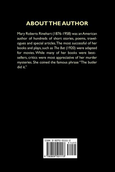 Mary Roberts Rinehart (1876-1958) was an American author of hundreds of short stories, poems, travelogues and special articles. Some of her very successful books and plays, such as "The Bat" (1920) were adapted for movies. While many of her books were best-sellers, critics were most appreciative of her murder mysteries. She also coined the famous phrase "The butler did it."