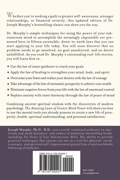 Murphy provides revolutionary mind-focusing techniques that have helped countless thousands discover the laws of cosmic mind power and apply them to their daily lives. Combining the insights of world religion with the discoveries of modern psychology, readers will reach new levels of spiritual understanding that will allow them to bring forth new health, new happiness, new prosperity, and a wonderful new life of inner fulfillment. Packed with examples of actual success stories, readers learn how they can change themselves from within to overcome illness, find love, increase their business by 300%, and advance to executive career positions.