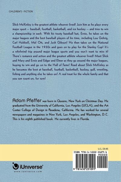 Slick McKinley is the greatest athlete whoever lived! Join him as he plays every major sport -- baseball, football, basketball, and ice hockey -- and tries to win a championship in each. With his trusty baseball bat, Ernie, he takes on the major leagues and the best baseball players of his time, including Lou Gehrig, Carl Hubbell, Mel Ott, and Josh Gibson! He then takes on the National Football League in the 1930s and goes on to play for the Stanley Cup! It's a whirlwind trip around major league sports and you won't want to miss it! There's romance and action and the greatest athlete whoever lived! Meet Slick and Mary and Ernie and Edgar and Elmer as they go around the major leagues, hoping to win and go on to the Hall of Fame! Read about Slick McKinley as he becomes the best at baseball, football, basketball, hockey, golf, wrestling, fishing and anything else he takes on! A real treat for the whole family and that you can count on, for sure!