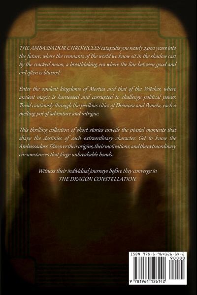 THE AMBASSADOR CHRONICLES promises a treasure trove of daring characters, bold worldbuilding, and twisted realties. Read through this anthology of short origin stories and discover the moments that created the path of adventure for each of the characters of THE DRAGON CONSTELLATION. Before joining the quest to save all of time and space, each of the characters was tested with events in their lives that brought them through their individual journey. It took over four decades for Vampire to bring together the Ambassadors in THE DRAGON CONSTELLATION, he spent these years collecting the players mentioned in the prophecy and searching for Monk and the right time to approach him. Ten individual character prequels come together in chronological order in THE AMBASSADOR CHRONICLES to tell the origin stories of Seer, Sorcerer, Monk, the Queen of Witches, Princess, AZ, Tinker, The Twins, Ghost, and Vampire himself and how these events in their pasts led to their collective journey into the heroes.