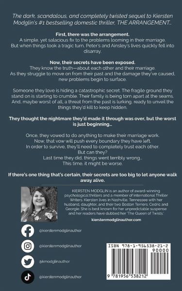 The dark, scandalous, and completely twisted sequel to Kiersten Modglin's #1 bestselling domestic thriller, THE ARRANGEMENT... First, there was the arrangement. A simple, yet salacious fix to the problems looming in their marriage. But when things took a tragic turn, Peter's and Ainsley's lives quickly fell into disarray. Now, their secrets have been exposed. They know the truth-about each other and their marriage. As they struggle to move on from their past and the damage they've caused, new problems begin to surface. Someone they love is hiding a catastrophic secret. The fragile ground they stand on is starting to crumble. Their family is being torn apart at the seams. And, maybe worst of all, a threat from the past is lurking, ready to unveil the things they'd kill to keep hidden. They thought the nightmare they'd made it through was over, but the worst is just beginning... Once, they vowed to do anything to make their marriage work. Now, that vow will push every boundary they have left. In order to survive, they'll need to completely trust each other. But can they? Last time they did, things went terribly wrong... This time, it might be worse. If there's one thing that's certain, their secrets are too big to let anyone walk away alive.