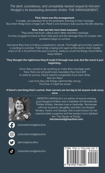 The dark, scandalous, and completely twisted sequel to Kiersten Modglin's #1 bestselling domestic thriller, THE ARRANGEMENT... First, there was the arrangement. A simple, yet salacious fix to the problems looming in their marriage. But when things took a tragic turn, Peter's and Ainsley's lives quickly fell into disarray. Now, their secrets have been exposed. They know the truth-about each other and their marriage. As they struggle to move on from their past and the damage they've caused, new problems begin to surface. Someone they love is hiding a catastrophic secret. The fragile ground they stand on is starting to crumble. Their family is being torn apart at the seams. And, maybe worst of all, a threat from the past is lurking, ready to unveil the things they'd kill to keep hidden. They thought the nightmare they'd made it through was over, but the worst is just beginning... Once, they vowed to do anything to make their marriage work. Now, that vow will push every boundary they have left. In order to survive, they'll need to completely trust each other. But can they? Last time they did, things went terribly wrong... This time, it might be worse. If there's one thing that's certain, their secrets are too big to let anyone walk away alive.